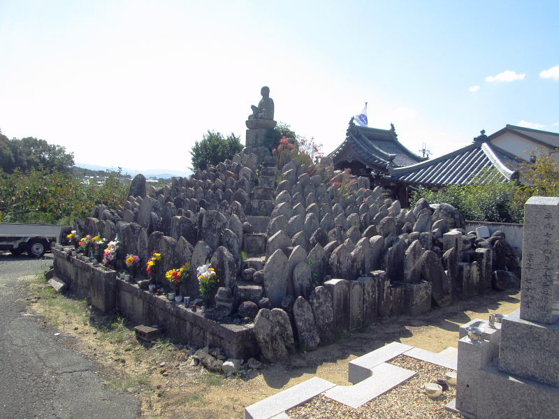 | 開基は奈良時代の僧・行基で、今は廃寺になって旧中山寺の一坊。門をくぐると正面に本堂、右手に鐘楼、左手に十三重石塔があり、坂上田村麻呂の墓もある。共同墓所の中には、山辺の道が通っている。 | |||||||||||||