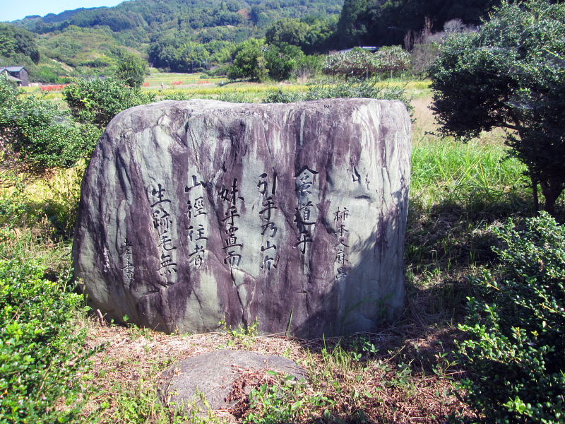| 万葉学者・犬養孝氏の力強い字体で刻まれた人麻呂の歌碑が道沿いにある。 歌碑「衾道を 引き手の山に 妹を置きて 山路を行けば 生けりとも無し」。 人麻呂が最愛の妻の亡骸を龍王山に葬り置き、茫然自失のままに山路を戻る心情を表した歌という、つらい歌です。 |