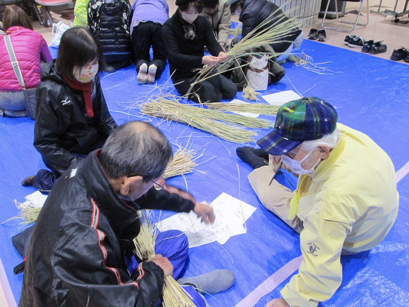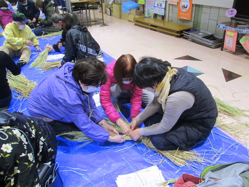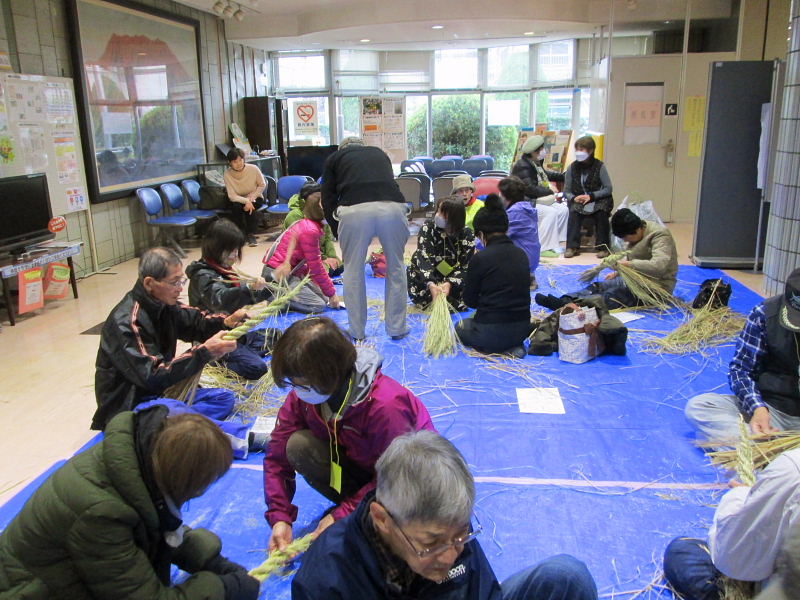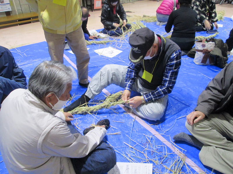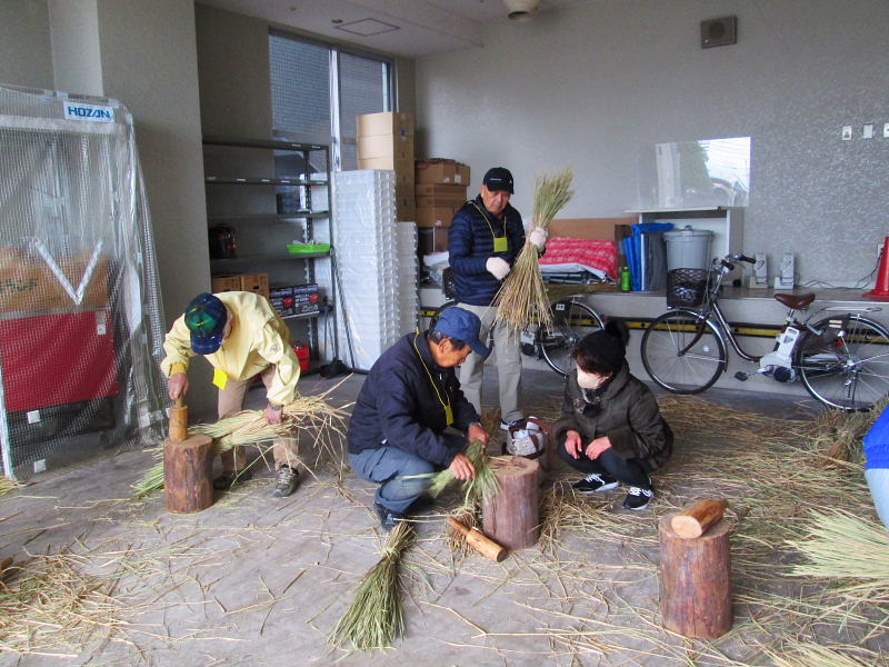 | 2024.12.14(土)、市民対象に@午前9時30〜、A午前11時〜、B午後1時30分〜と3組に分かれて其々10名〜12名ずつ36組(お家族を含み50人弱)の年末恒例のお正月の「しめ縄作り」が行われた。早朝から古文化同好会の会員の皆さんが会場や藁の準備をされ、しめなわ作りを指導された。 講師・指導は、古文化同好会の18名の有志の皆さん。会員の小野さんご夫婦のご厚志により、注連縄が作れる良い藁をたくさん作って戴き大変お世話になりました。誠に有難うございました。 午前9時30分開始前から続々と市民の皆さんが集合、会場「ゆうゆうセンターの1階ロビー」はあっという間に埋まってしまった。わらを打ち、穂先を揃えて左に捻りながらの左綯い作業は難しく、皆さん、真剣に取り組まれ、小さいお子さんもわらを手に、お父さんやお母さんと一緒に作業を手伝った。子供連れのご家族で参加されたお元気なお母さん、「初めて注連縄つくりに参加しました、皆さんに教えて貰いながらのしめ縄づくり、大変楽しかったです。」と笑顔で参加された。 参加された皆さん、見事に仕上がったしめ縄を手に、「立派なしめ縄が出来て嬉しいです、お陰様で良い正月が迎えられます、有難うございました」「今年も参加でき嬉しいです」「来年もお世話になりたいです」と、口々にお礼を言われながらお帰りになった。 最後に御幣作りにも挑戦され、出来上がると歓声が上がった。早く出来上がった方は、リース型しめ縄作りなどにも挑戦されました。 来年こそは良い年になりますようにと、皆さん楽しみながらの「しめ縄作り」でした。 当日、協力参加いただいた会員の皆さんは次の通り(18名)です。(敬称略) 厚主、巽、小野、川端、梶、向井、竹澤、谷崎、藤田、吉岡、崎山、村田さんの12名の皆さんに、女性会員6名(野村、片岡、前川、岸田、大門、大澤さん)の皆さんがお手伝いなどに参加され最後まで楽しみながらしめ縄づくりが行われました。 |