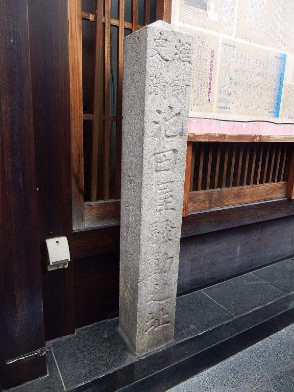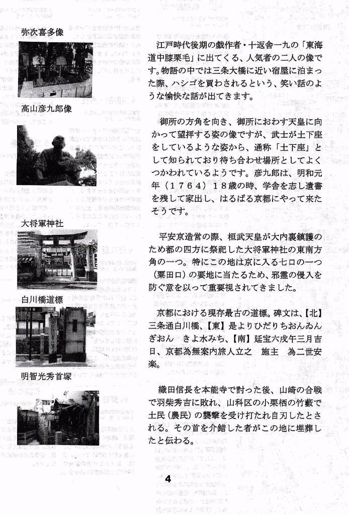 | 御所の方角を向き、御所におわす天皇に向かって望拝する姿の像ですが、武士が土下座をしているような姿から、通称「上下座」として知られており待ち合わせ場所としてよくつかわれているようです。彦九郎は、明和元年(1764)18歳の時、学舎を志し遺書を残して家出し、はるばる京都にやつて来たそうです。 |