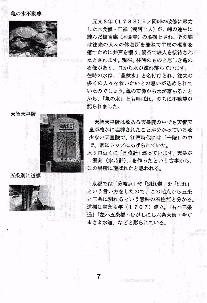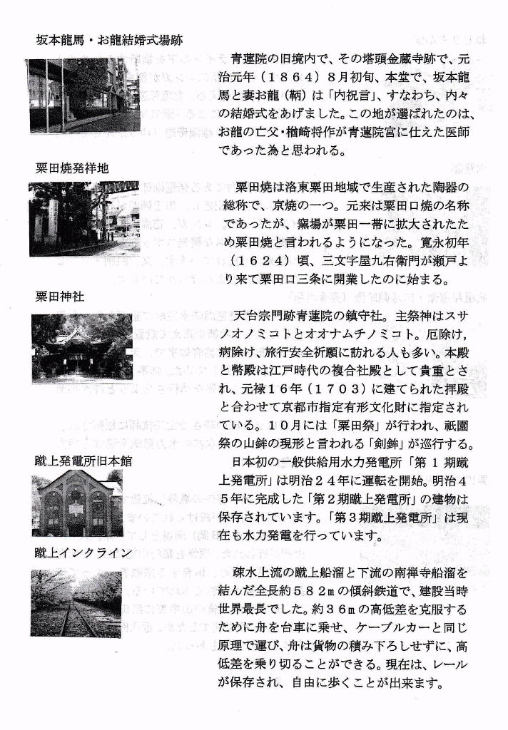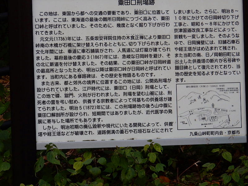 | 古来、都と郊外の境界に位置するこの地には、公開処刑場が設けられていました。江戸時代には粟圏口(日岡)刑場として、傑、獄門,火刑が行われた。刑場を臨む山裾には、刑死者の霊を弔い慰め、供養する宗教者によつて何基もの供養塔が建てられている。明治5年には、刑場跡地の後の山中腹に粟田口解剖所が設けられ、短期間でしたが、近代医学の発展に寄与した場所でもあった。 |