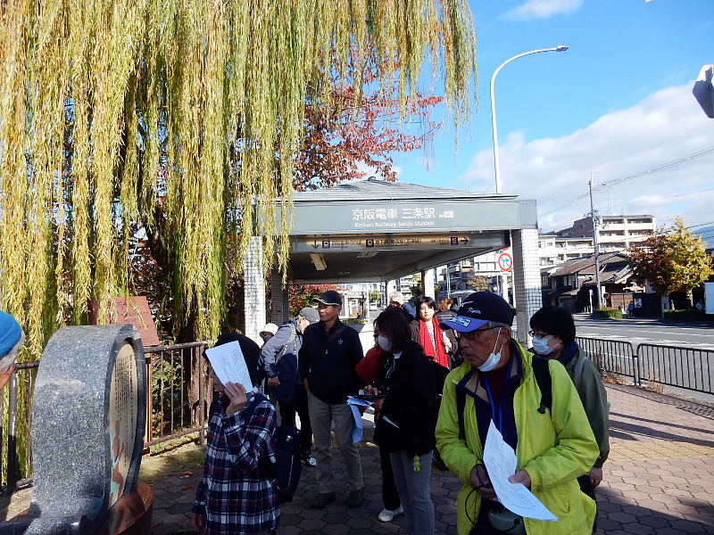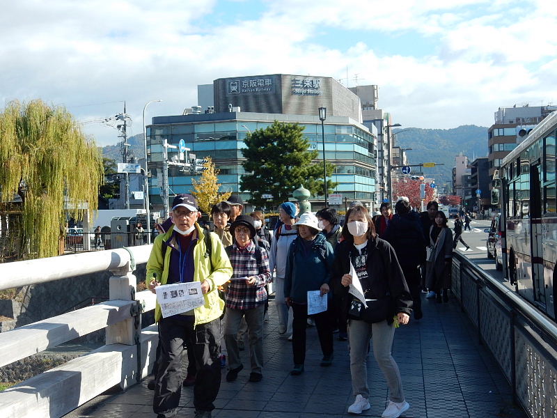 本日案内していただく森岡さん(古文化同好会)より、本日の行程及び注意事項について、京の町は紅葉が始まりどこも混雑しています、信号を渡るときは無理をしないで余裕を持って渡るよう、全員が渡るのを確認してから出発します。等の説明があり出発です。 |
