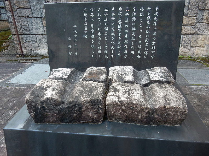 | 京都三条大橋・大津間の三里(約12km)の道には、江州米(近江米)などの物資を運送する牛車の運行を楽にするために、花崗岩の厚板石が敷き詰められていた。この石が車石と呼ばれており、溝は牛車の頻繁な運行によって擦り削られてできたものです。 |