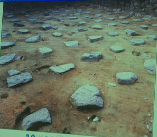 | 安土城復元図を示して講演される近藤所長 | 天主の礎石(穴蔵) |
