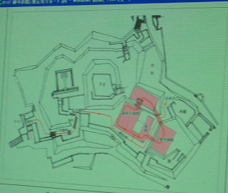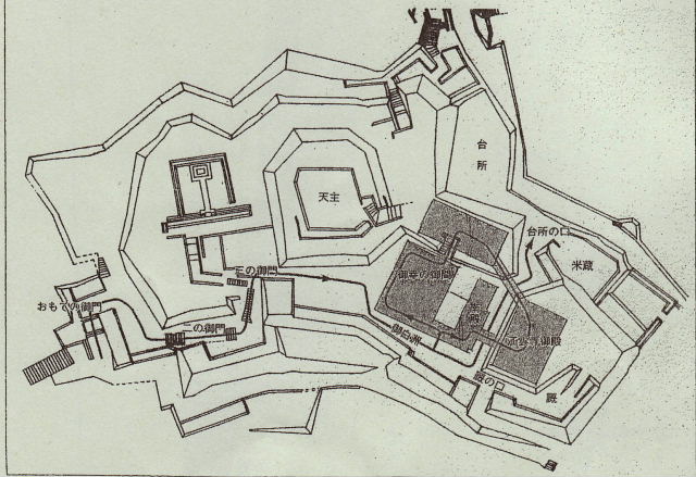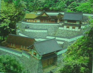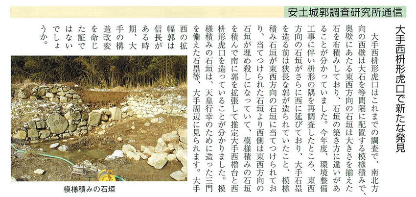 | 大手道周辺地区 三門を配した大手石塁と城内路および櫓推定地 中央が大手門、右の東虎口(行幸門・公家専用門) 左に西虎口2(武家専用門)西虎口1(通常大手門) 城の南側約百十メートルの間に大手門を含め、四か所の出入り口「虎口(こぐち)」があり、 すべて大手道につながることも判明。ただ、一番西側だけは門をくぐるといったん突き当たり、 さらに直角に曲がるともう一つの門がある堅固な戦国時代特有の枡形(ますがた)虎口だった。 |