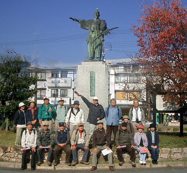 ![]() JR安土駅前の信長の銅像前で記念撮影 皆さん もう、すっかり信長になりきっていますなぁ! |
