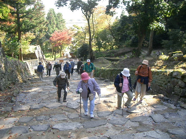 ![]() 安土城跡・天主を目指して、杖を片手に大手道の石段を登る 3時ごろ |