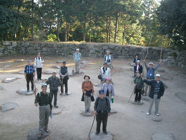 ![]() 安土城跡天主の礎石に並び、気勢を上げて記念写真 |