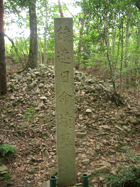 ![]() 墓柱の背後には、大小の小石が小高く積まれている。 ついに、饒速日命の墳墓(檜の窪山)に出会えました! |
