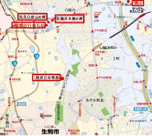 鳥見白庭山の碑は饒速日命の住居跡にある生駒郡北倭村大字白谷2838番地に あって、地元では「ひろしばこ」と称する数畝の畑地とある。(生駒市史) |