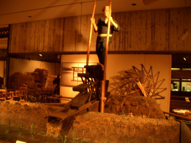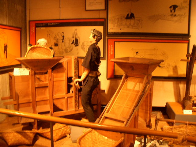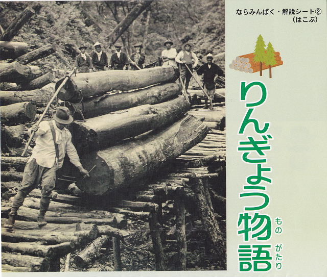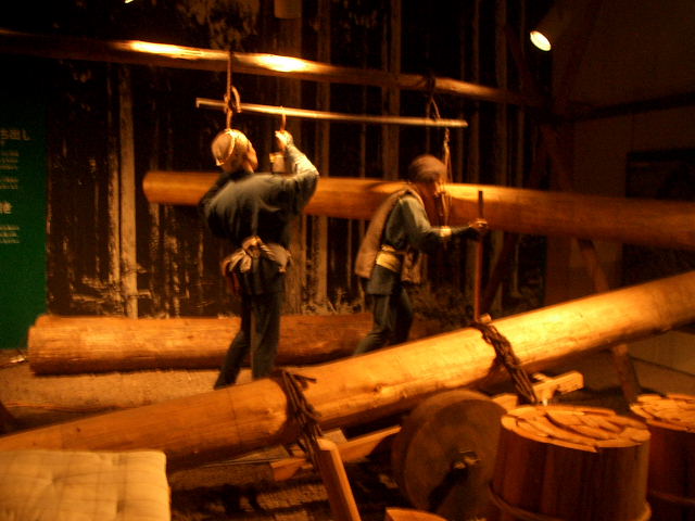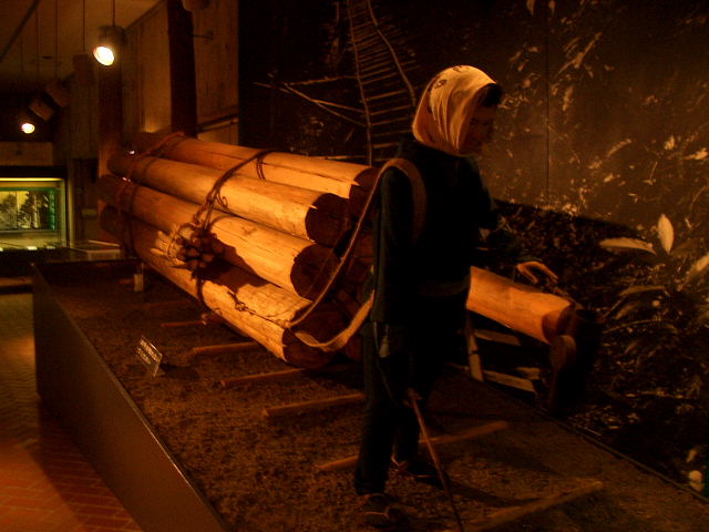 ![]() これは、木馬(きんま)出しという材木の出し方。 木の上をうまく滑らせて運ぶ |
