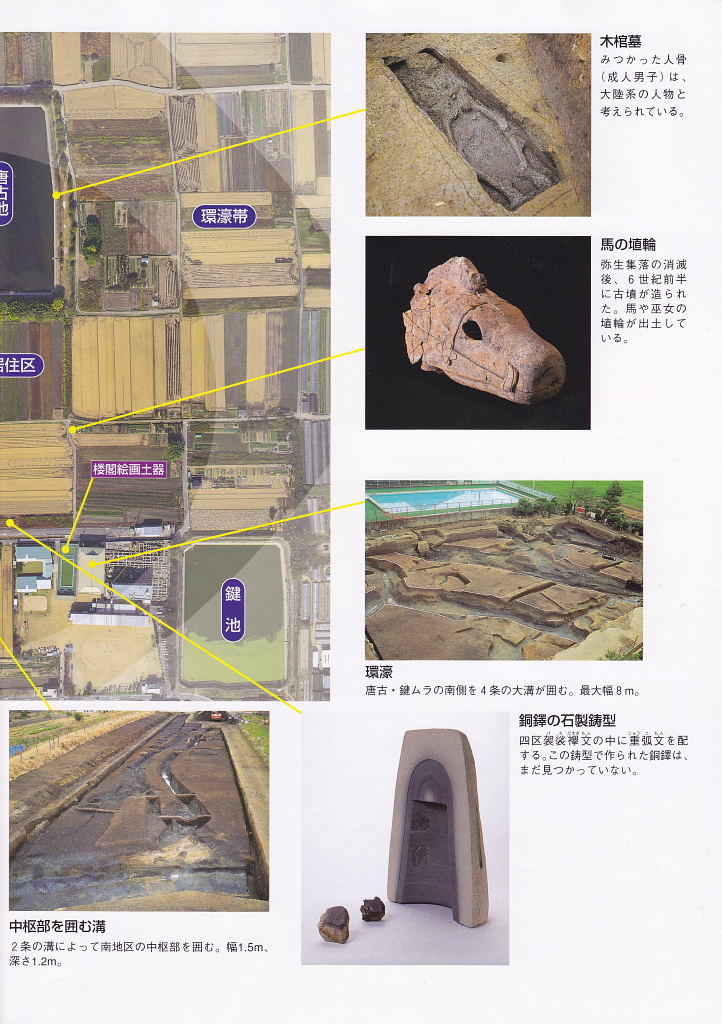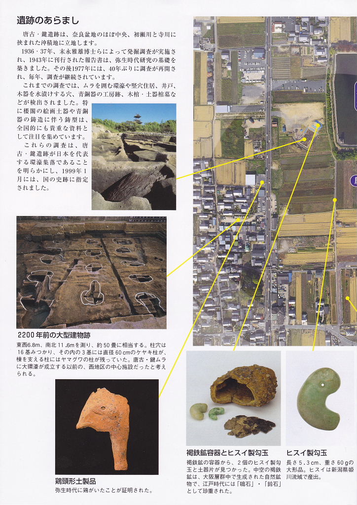 | 唐古・鍵遺跡は、今からおよそ2,000年前に栄えた、弥生時代の代表的な集落です。 奈良盆地のほぼ中央、奈良県磯城郡田原本町大字唐古および大字鍵に位置します。 遺跡面積の約42ヘクタールは近畿地方最大です。直径約400mの範囲が居住区で、 その周りには幾重にも「環濠」が巡っていました。 遺跡は弥生時代前期(約2,300年前)に成立し、古墳時代前期(1,700年前)までの 約600年間続きました。昭和11年の第1次調査では多量の土器・石器・木器が出土し、 その成果は弥生時代研究の基礎となりました。昭和52年の第3次調査以来継続的な 調査が行われ、多数の絵画土器や青銅器鋳造施設の発見など重要な成果が相次ぎました。 その重要性から、1999年1月27日、国の史跡に指定されました。 田原本町では、現在史跡指定された約10ヘクタールの公有化事業を進めています。 公有化された土地は、史跡公園として整備する予定です。 |