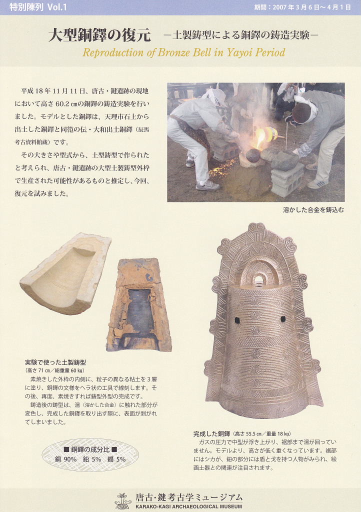 2004年11月24日にオープンし、これまでに出土した膨大な資料の一部を展示しています。 展示品として有名なものに、絵画土器、重文に指定されている「牛形埴輪」、 銅鐸の鋳型や褐鉄鉱容器に入ったヒスイの勾玉などがあります。 このミュージアムは、田原本の考古資料を中心とした展示品で構成されています。 特に日本を代表する弥生時代の環濠集落である唐古・鍵遺跡の出土品を中心に展示されています。 貴重な資料が多くあり、当日は沢山の出土品について大変詳しく解説いただいた。 |