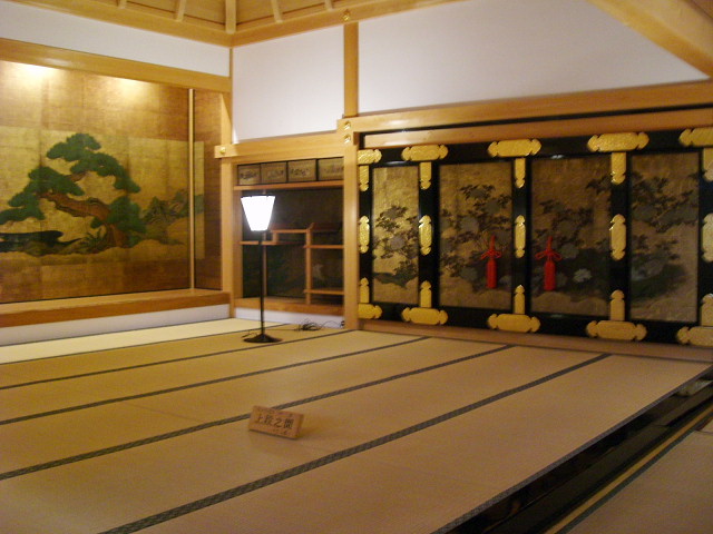 ![]() 上段の間は最も格式の高い部屋であり、幅3.5間(6.9m)の大床、その左手に 付書院、右手に違い棚、帳台構が設けられている。往時の雰囲気を再現させるため、 江戸時代初期の狩野派絵師が描いた屏風絵を障壁画として転用している。 |
