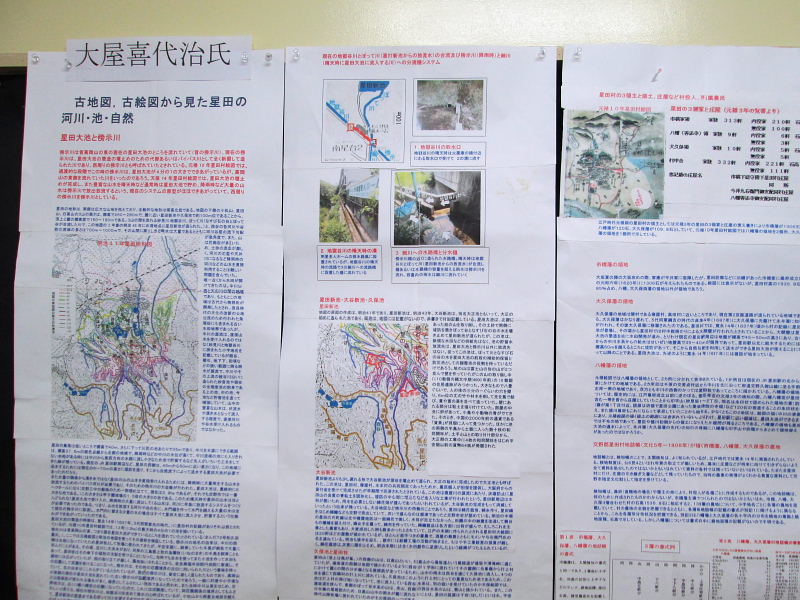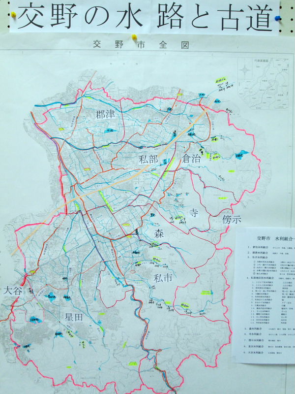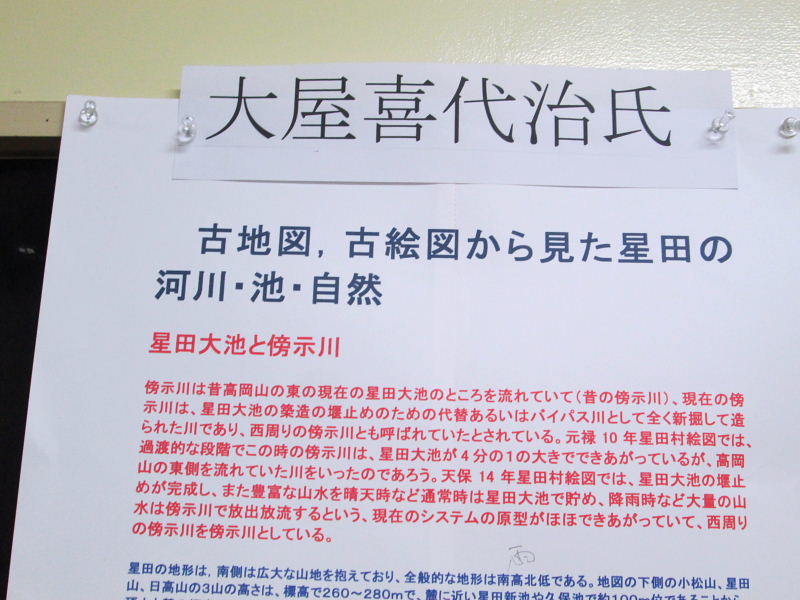 今年初めて展示しました、「交野の水路と古道」(交野の山・川・池・水路・古道)は一部未調査の部分もありましたが、会員の皆様や市民の方々から質問や感動の言葉を頂きました。今後、交野の先人の汗と知恵とともに水の諍いなどを纏めて、再度発表したいと思います。