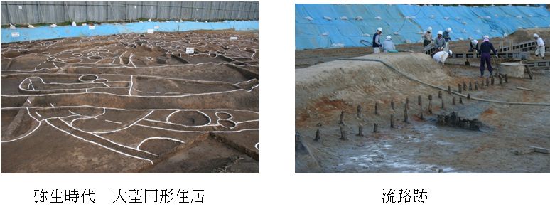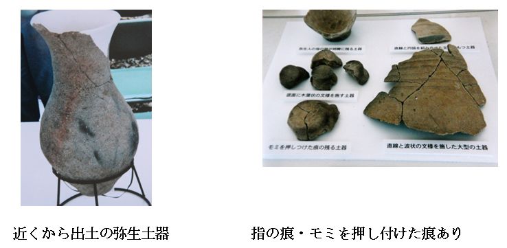 | 槃若寺の南側からは、縄文時代の鉢、弥生時代前期の竪穴住居、住居の中から壺、甕、鉢など弥生土器が出土しました。サヌカイトを用いて製作された石鏃や石錐などの石製品も出土しています。 | |||||||||||||||||||||||||||