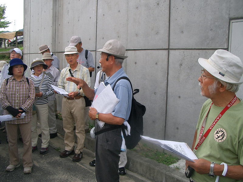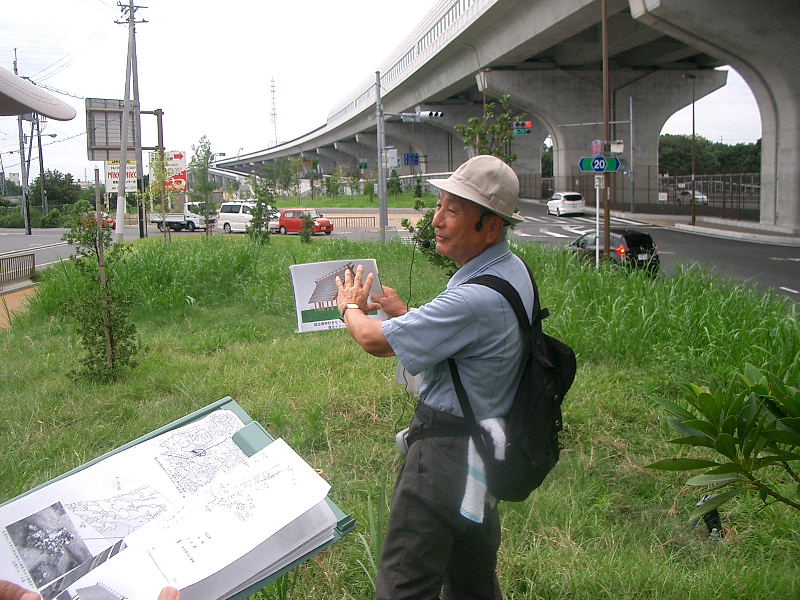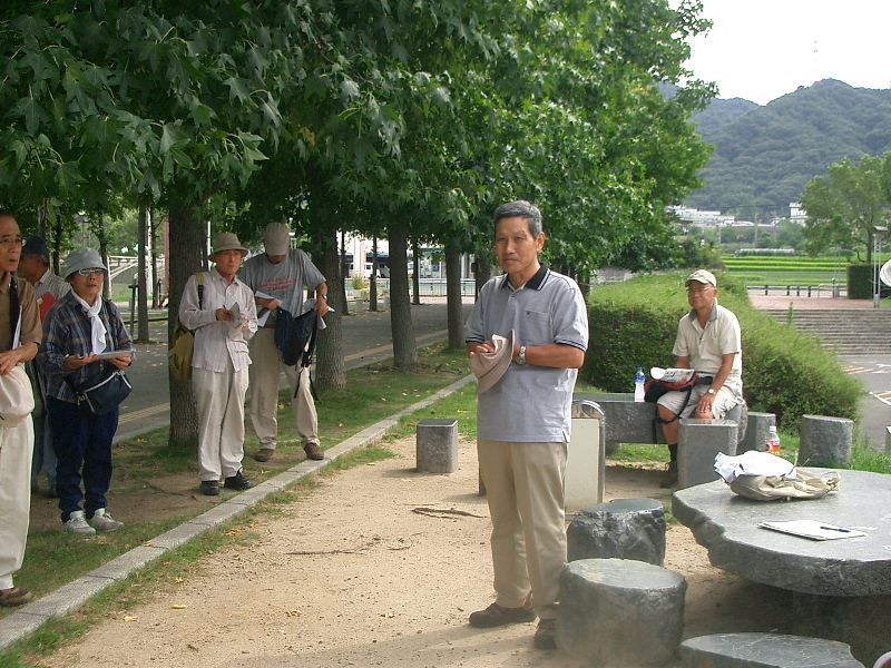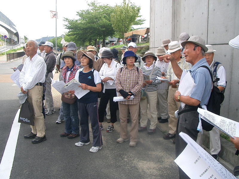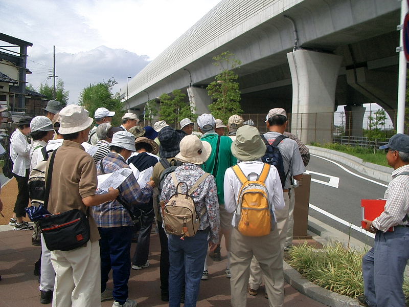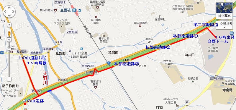 | 日時 : 2012年9月8日(土)午前10時 いきいきランド・交野ドーム集合 参加者 32名(内会員23名) 行程 : 交野ドーム → 第二京阪国道の側道・私部南遺跡 → 天の川 → ホームセンターコーナン・上の山遺跡 周辺 12時解散 約 2.5km徒歩 案内人 : 高尾秀司氏 (交野古文化同好会) |
