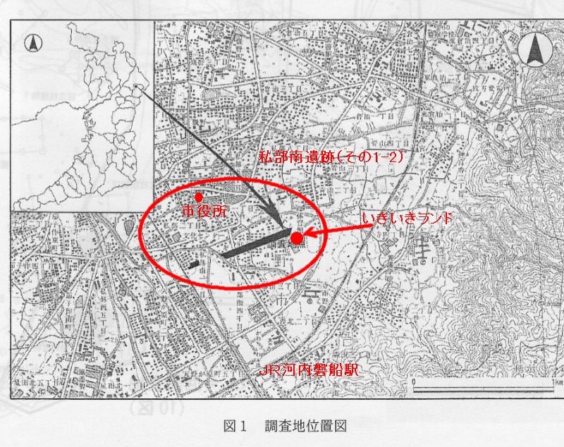 | 私部南遺跡はいきいきランド交野から、京阪電車交野線にかけての非常に広い範囲に埋もれています。 これまでの発掘調査で、現在では平坦に見えるこの地域に、南東から北西方向に広がる3か所の谷地形があったことが、地層の堆積の様子から明らかになりました。 さらに、旧石器時代から近世にかけて石器や土器などの生活用具類が豊富に見つかり、ここで暮らした人々の住まいや井戸、水路の跡なども出てきました。 |
