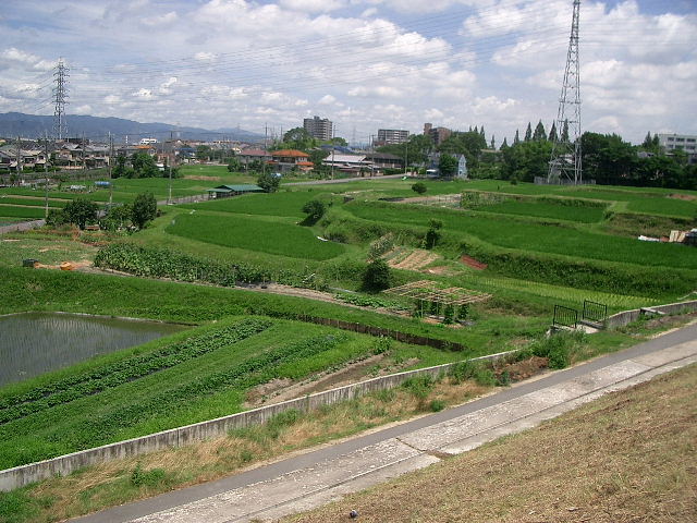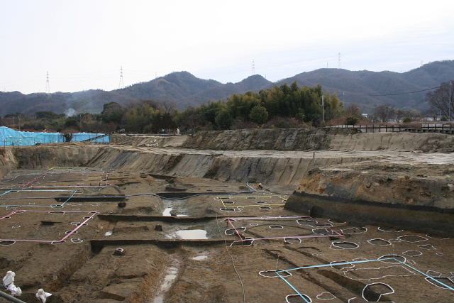 さらに、2世紀ごろになると、いきいきランド交野北西側の向井田地区付近に、シガラミが数か所築かれていました。 シガラミとは、たくさんの木の杭を打って水をせき止めて水量を調節し、田に水を導くために設けられた堰のことで、このころ、周辺に本格的なかんがい用水路と水田が広がっていたと推測されます。