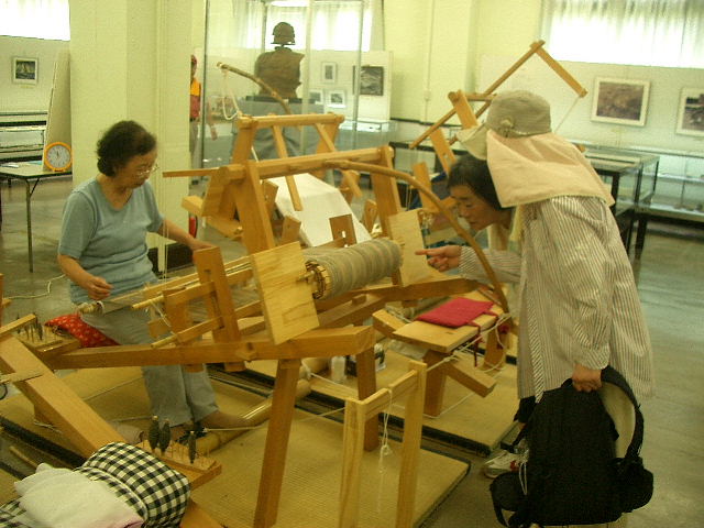 機織りが実演されている |