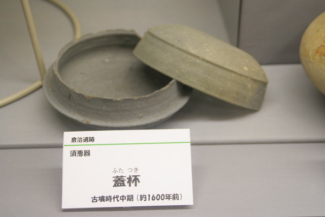 倉治遺跡からは須恵器と呼ばれる灰色の土器が見つかりました。須恵器は5世紀前半に朝鮮半島から伝わったまったく新しい技術により製作された土器です。 左の写真の土器は、口径約18センチ、高さ約30センチもある甕です。水などの液体や穀物を貯蔵するために用いられたと考えられます。 右の写真の土器は、2つ合わせて蓋杯と呼ばれ、現在のふた付きのご飯茶碗に当たります。 下の部分は杯身と呼ばれ、口径約12センチ、高さが約4・8センチです。上の部分は杯蓋と呼ばれ、口径約12センチ、高さが約4センチです。みなさんの使っているご飯茶碗の大きさと比べてみてどうでしょうか。 これらの須恵器はいずれも5世紀後半のものと考えられます。