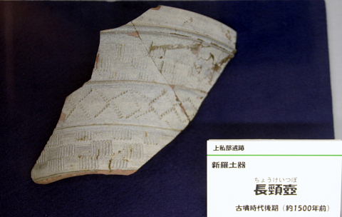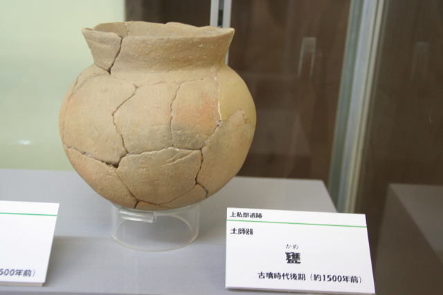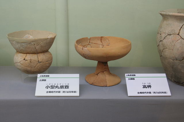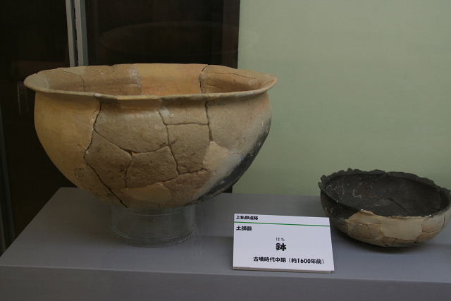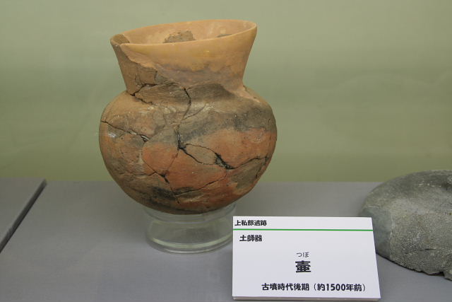 上私部遺跡は、5世紀前半ごろから7世紀初めごろの約二百年にわたって集落が営まれ、中でも6世紀ごろか後半にかけてはもっとも栄えていたことが発掘調査によって明らかにされています。 これらのうち、5世紀のものには土師器や須恵器などの土器のほか、石製の玉類などが見られます。