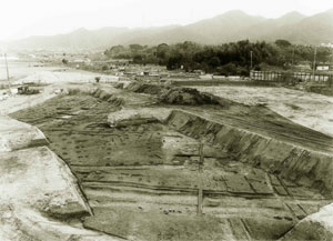 飛鳥時代から後に、厚い砂のたい積が見られました。 このことから、付近で数回にわたる土砂災害が起こったことが分かります。それらの土砂がたい積していく途中の地層からは、平安時代の土器や中世の犬の骨、畑の跡などが見つかり、やがて現在の地形になっていったことが分かりました。 |