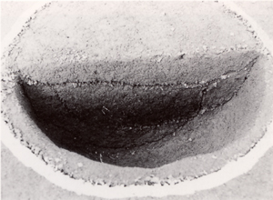 遺跡から、火を受けたために壁面が真っ赤に焼け、底に炭の溜まった四角と丸い形をした穴が見つかりました。
