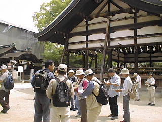 | 藤森神社の前で本日のウォークの 趣旨を説明される平田さん 48回目にして交野から踏み出した 梅雨の時季、神社の二つの庭 には3500株の色彩々の 紫陽花が見事である。 |