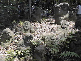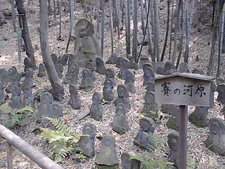 | 正徳3年(1713)千呆(せんがい)禅師創立の黄檗(おうばく)宗の寺。 本堂背後の山中に江戸時代の画家伊藤若冲(いとうじゃくちゅう)(1716〜1800)が下絵を描き,石工に彫らせた五百羅漢がある。 羅漢とは釈迦の弟子で,五百羅漢といえば,優秀な弟子五百人という意味であるが,若冲の磊落な筆法で下絵を描かれた石仏は,長年の風雨を得て丸み,苔寂びその風化に伴う表情や姿態に一段と趣きを深めている。 伊藤若冲は江戸時代中期,正徳六年(1716)二月八日京都の高倉錦小路南東角にあった青物問屋「桝屋」に長男として生まれた。 名前は代々伊藤源左衛門を名乗り,店の名は,屋号と名前から「桝源」といった。 40歳の時に次弟の宗厳に家督を譲り,隠居して絵を描くことに専念する。 絵は写生を基礎とした動植物画が有名で,特に鶏の絵は画幅から今にも飛びだしそうなくらいリアルである。 五百羅漢は一説には,天明八年(1788)正月におこった京都大火災で焼け出された若冲がこの石峰寺門前で妹と暮らすようになり,石峰寺後方の山中に石像の五百羅漢を建立する事を思い立ち,絵1枚につき米一斗分の代金を受け取り,その金でみずからデザインした石の羅漢を一体ずつ石工に彫らせ,奉納配置していったという。しかし実際には天明大火の二年前に刊行された『拾遺都名所図会』にすでに「石像五百羅漢」の記事があり,建立はもっと早い時期からはじまったらしい。 明治以降荒廃していた羅漢山は龍潭和尚の篤志により,草を払い径を開き,個々の石仏の趣を見られるように整備されたものである。 |