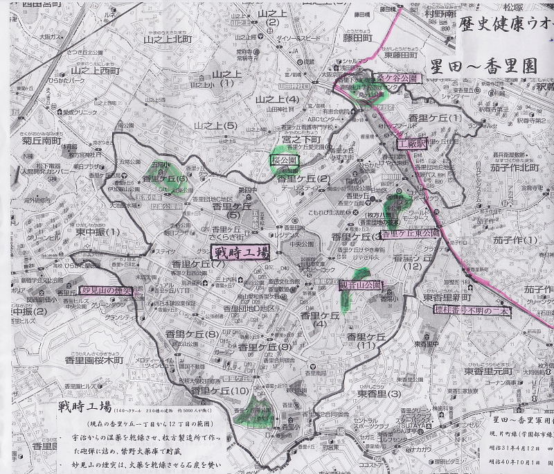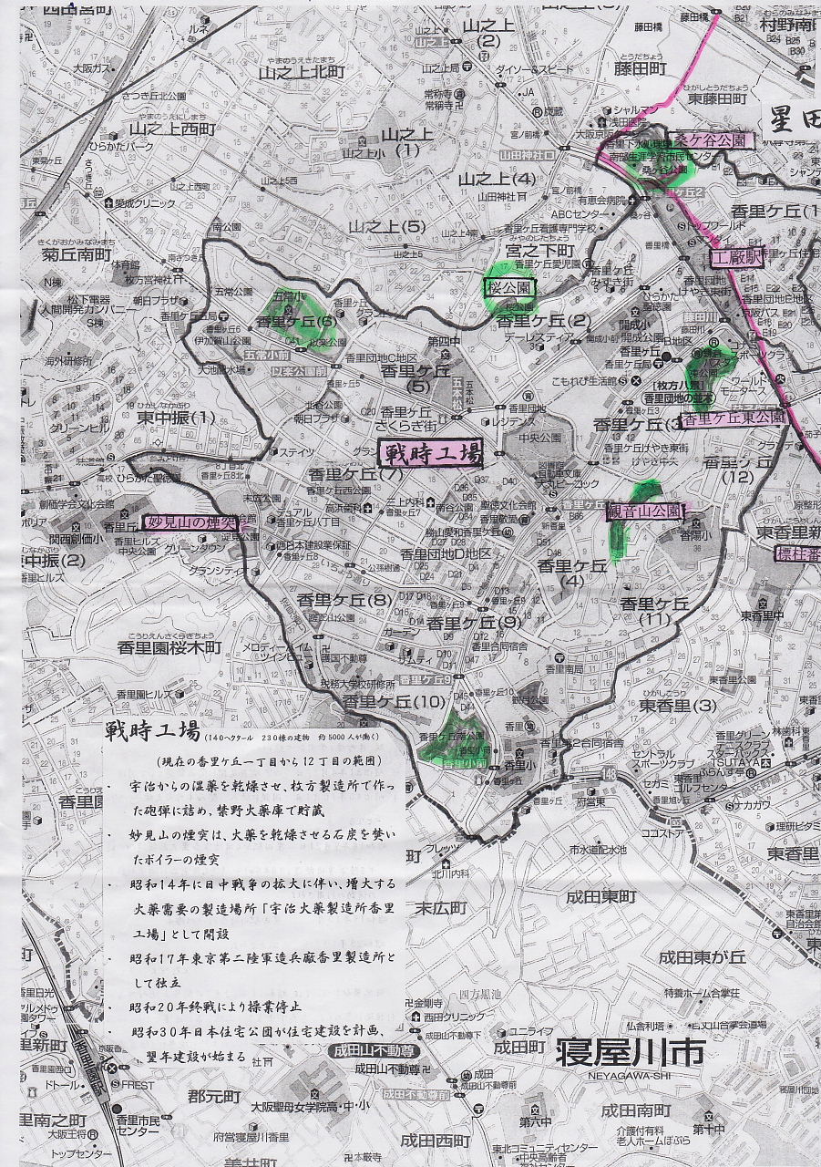 ![]() 現在の香里ケ丘1丁目から12丁目までの範囲、140ヘクタール、230棟の建物、約5000人が働いていた。 宇治からの湿薬を乾燥させ、枚方製造所で作った砲弾に詰め、金や火薬庫で禁野火薬庫で貯蔵。 妙見山の煙突は、火薬を乾燥させる石炭を焚いたボイラーの煙突。 昭和14年に日中戦争の拡大に伴い、増大する火薬需要の製造場所「宇治火薬製造所香里工場として開設。昭和17年東京第二陸軍造兵廠香里製造所として独立。昭和20年終戦により操業停止。昭和30年日本住宅公団が住宅建設を計画、翌年建設が始まる。 |