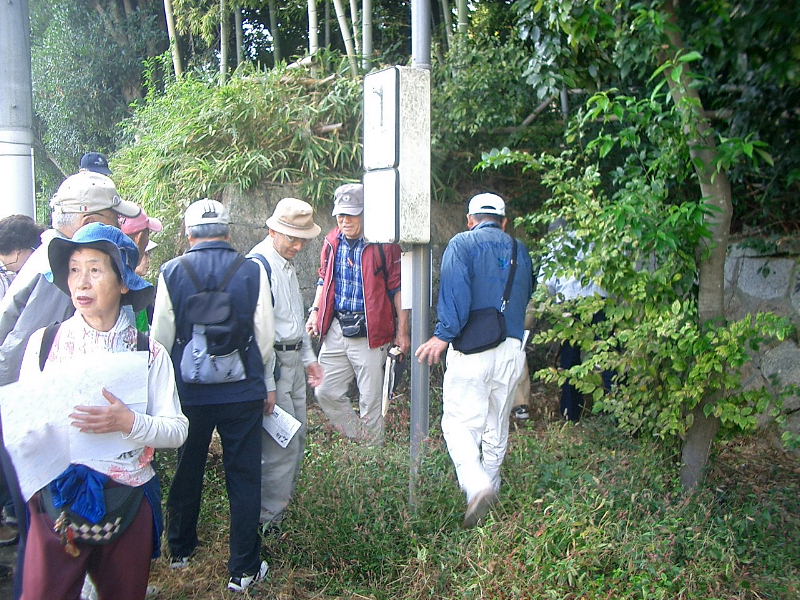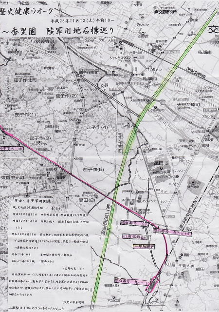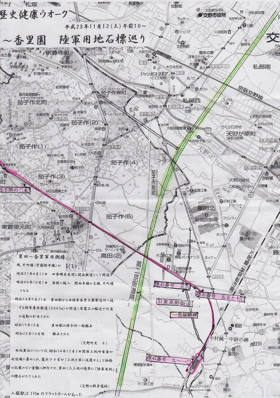 | 交野歴史健康ウォーク118回は、前回の大阪城周辺の史跡と戦跡巡りに引き続き、星田から香里園まで、陸軍用地石碑を巡る戦跡ウォークを開催しました。 2011年11月12日(土)午前10時、JR星田駅集合。朝から秋晴れに恵まれ絶好の歴史健康ウォーク日和となりました。 参加者は古文化同好会の元気なメンバー会員18名、会員外8名の合計26名。 今回案内して頂いた綱分清美さんが、星田から香里園にかけて、旧陸軍軍用用地を丹念に歩かれ発見された沢山の石標を巡るという大変貴重な体験となりました。 これまでは、星田北6丁目に1本だけ残っているとの認識でしたが、新たに昨年2本を発見され、その後、茄子作りで2本、香里ケ丘1丁目の桑ケ谷公園で10本、香里ケ丘2丁目の桜公園で5本、香里ケ丘3丁目の香里ケ丘東公園で埋設・切損を合わせて9本、香里ケ丘4丁目の観音山公園で埋設・切損を合わせて7本を発見された。 今回のウォークは、発見されたうちの星田、茄子作り、桑ケ谷公園を案内していただきました。 |