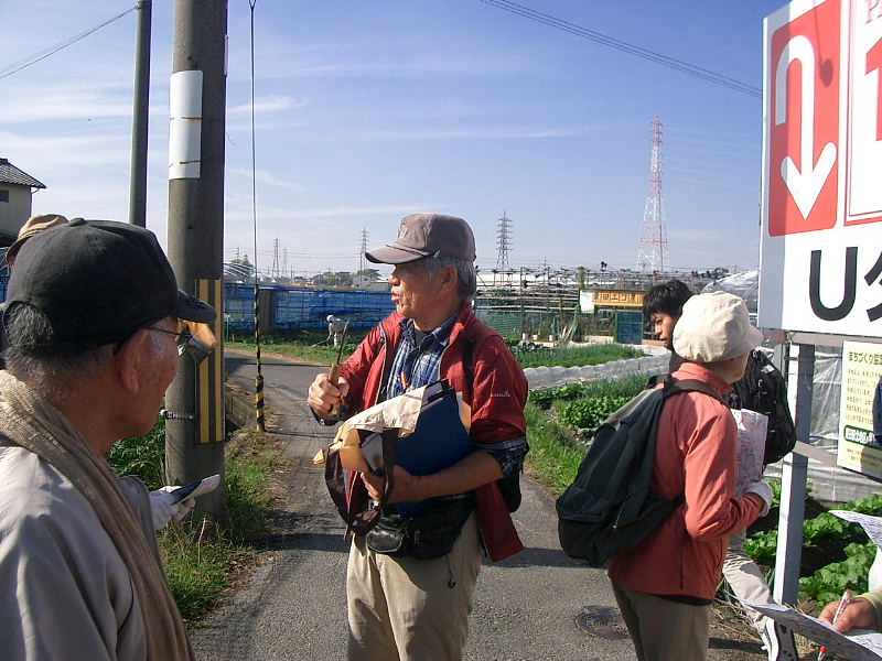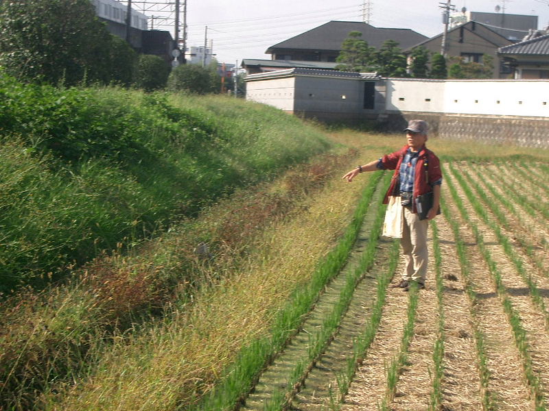 | 星田駅北の田圃の畔に、説明される綱分さん |