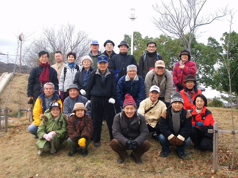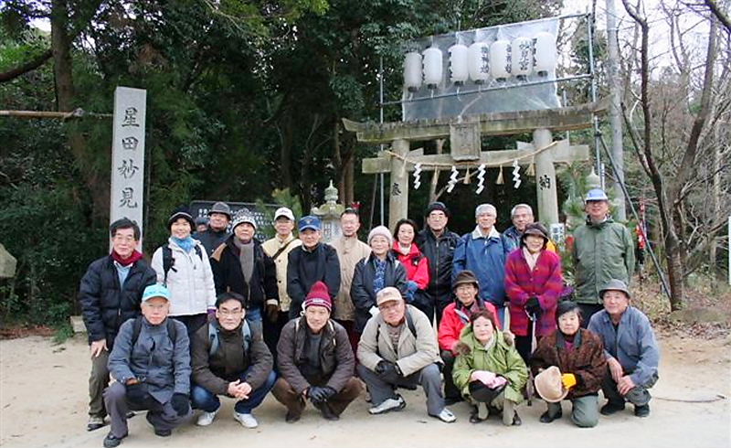 2009年1/2(金)、天候曇り時々晴れ。早朝から冷え込みが厳しくどうなる事かと心配しましたが、幸い風もなく、「明けましておめでとうございます」「どうぞ今年も昨年同様よろしくお願いします」と、挨拶を交わしながら妙見口に集合した。 中会長と平田さんの新年の挨拶の後、妙見宮への妙見河原の桜道をゆっくりと上ると、妙見宮の前で星田や私市の地元の方々が合流され、総勢22名の元気な皆さんが顔を揃えられ、早速全員で記念撮影。 |