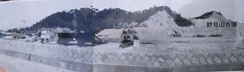 | 昭和43年12月、妙見山古墳が発見され、発掘調査された当時の写真である。 左端が妙見宮の森、妙見山(162m)の峰続きに古墳が発見された。 |
