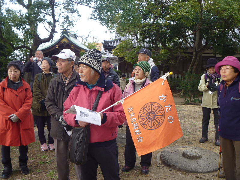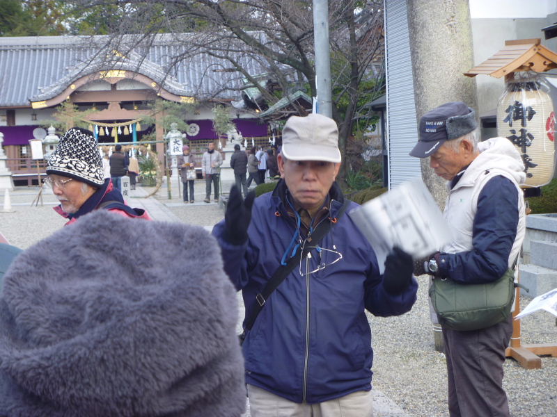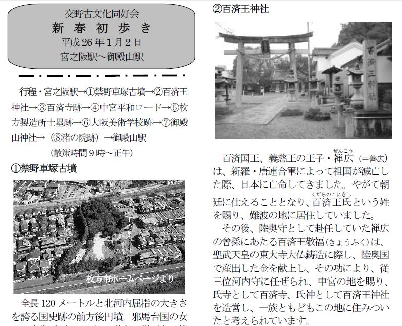 | 2014年1/2(木)、天候晴れ。今年の正月は大変穏やかな年明けで初歩きとしては最高の天候の中、ゆっくりと歩くことが出来ました。早朝から宮之阪駅には、「明けましておめでとうございます」「今年も昨年同様どうぞよろしくお願いします」と、挨拶を交わしながら続々と集合された。 村田部長の新年の挨拶の後、伊東征八郎様の案内で宮之阪駅から御殿山駅まで、交野ケ原を南から北へ史跡めぐりと初詣、初歩きに相応しいコースを探訪してきました。御殿山神社では御神酒と焼芋を戴き、交野古文化同好会の繁栄と会員の健康を願って参拝してきました。本日の参加者は元気な総勢31名(会員外9名)の皆さん、新春の初歩きを存分に楽しまれたようで、「天気も良く、交野ケ原の史跡めぐりに初詣もできて、良い正月を迎えられ幸せです」と感想を頂戴しました。 伊東さんには綿密な事前の準備と下見に万全を期していただき、ゆっくりと噛み締めるように大変分かりやすくご案内いただきました。また、当日配布のレジメを提供いただき誠に有難うございました。 記して感謝申し上げます。 |