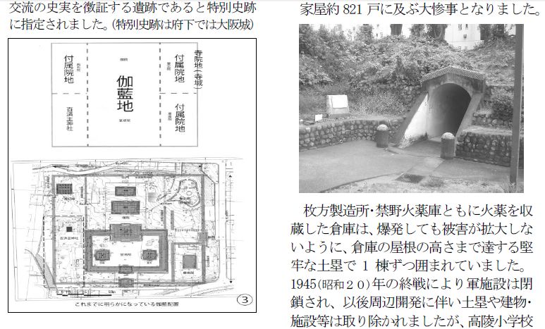 | 戦前この一帯には、陸軍の兵器用火薬や砲弾・弾薬を収蔵する禁野火薬庫があった。最大時にはここから現在の市民病院に至る敷地を擁し、さらに1938年(昭和13年)には、東隣にその面積を上回る枚方製造所が設置される。これによって、砲弾や弾薬の製造と火薬の充填が一貫して行われるようになり、国内屈指の市大軍需施設となった。 禁野火薬庫は、1939年((昭和14年)3月1日に大爆発を起こし、火薬庫は勿論周辺の住民に大きな被害をもたらした。軍人・民間人を含む死者は100人近くにのぼり、家屋の全半焼821戸および多数の負傷者を出す大惨事であった。 事故後、禁野火薬庫は縮小され、北側のおよそ3分の2の敷地が枚方製造所に移管されるが、戦争の激化とともに新たに大阪陸軍造兵廠の火薬・信管工場がこの敷地に移転してくる。ここに現存する土塁は、それに伴うしせつである。 枚方製造所・禁野火薬庫ともに火薬を収納した倉庫は、仮に爆発しても被害が拡大しないように、倉庫の屋根まで達する堅固な土塁で1棟ずつ囲まれていた。1945年(昭和20年)の敗戦により軍施設は閉鎖されたが、以後団地の造成に伴い土塁や建物・施設などは取り除かれ、わずかにこの一角と高陵小学校の東側だけに土塁が残り、戦争の生き証人となっている。 枚方市は、1982年(昭和57年)12月に「非核平和都市宣言」を行うとともに、禁野火薬庫大爆発から50年目の1989年(平成元年)3月1日に、「3月1日」を「平和の日」と定めた。さらに、1995年(平成7年)の被爆・戦後50周年を機に、この土塁を平和のモニュメントとして位置付けた。 2008年(平成20年)3月 大阪府・枚方市 |
