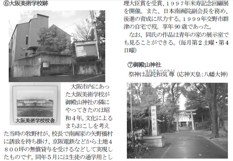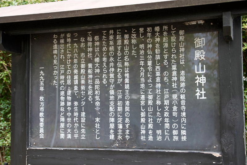 | 祭神は品陀(ほむだ)和気(わけの)尊(みこと)(応神天皇:八幡大神) 御殿山神社は、元は渚の院跡の観音寺境内に設けられていた小倉の粟倉神社のお旅所であった。江戸文政年間(1818〜29年)、渚村に産土神勧請の話が起こり、お旅所に八幡大神を勧請して西粟倉神社と称した。明治初年の神仏分離令によって、1869年(明治2)御殿山に社殿を造営し、翌年当地に遷宮し、御殿山神社と改称し、現在に至っています。 御殿山の名は、惟喬親王の渚院のあずまやに起源すると伝わるが、江戸初期に領主永井伊賀守がこの山に陣屋を設けたところから、呼ばれるようになったとも言われる。 美術センターの建設に先立ち1986年の発掘調査で弥生時代やから平安時代にかけての住居跡・建物跡などが見つかりまた。また、江戸時代の建物跡など陣屋に関する遺構も見つかっています。 |