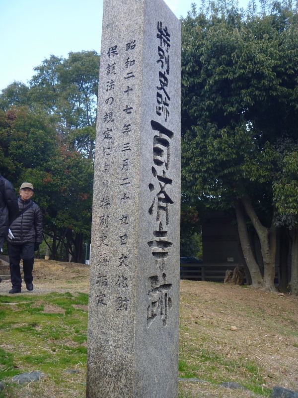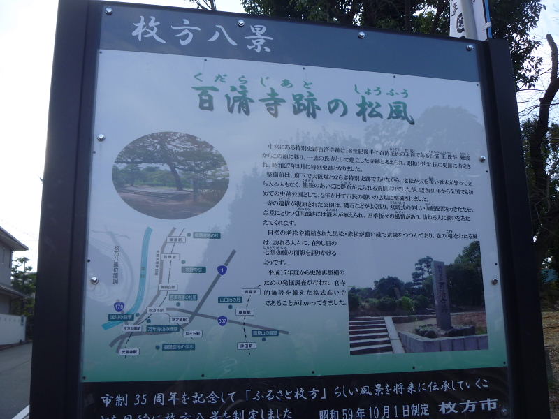 | 百済寺跡は、百済最後の国王、第13代義慈王の後裔(こうえい)、百済王氏が8世紀中頃に建立した氏寺の跡。5代孫の百済王敬福が氏寺として百済寺を創建して一族の繁栄の基礎を築いたとされています。 百済寺の造営された地「交野」は、桓武天皇が延暦4年(785)に日本で始めて天壇を築き効祀(こうし)をおこないました。まさに「天地交わる」処に相応しい名前といえます。 平安時代初期には天皇や皇族が鷹狩りなどの遊猟を楽しんだところとして著名です。 百済王氏は、桓武・嵯峨朝には両天皇の交野行幸の折にはここを舞台に饗応を重ね一族の昇進にあずかるとともに外戚としての地位を高めました。特に桓武天皇は生母、高野新笠が百済の武寧王の子孫であったことから百済王氏を[朕が外戚]として特に優遇しました。百済寺跡は、百済王氏の本拠地を交野に移して以降の盛衰を象徴する遺跡といえます。 また、伽藍配置は双塔式の伽藍配置で統一新羅時代の影響が見られ、渡来系氏族の氏寺に相応した伽藍形式と言いえます。 なお、1952年には古代史に於ける日朝文化の交流の史実を徴証する遺跡であると特別史跡に指定されました。(特別史跡は府下では大阪城) |