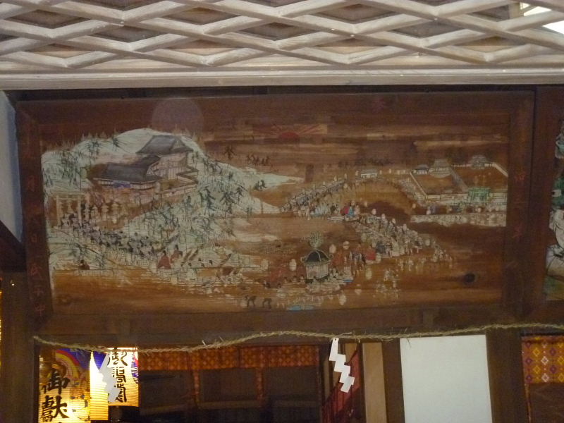 | 御殿山神社絵馬御殿山神社の遷宮を描いた奉納額です。縦76センチメートル、横176.5センチメートルを測ります。御殿山神社は、渚院跡の観音寺境内に隣接して文政年間(1818〜1829)に設けられた西粟倉神社が、明治初年の神仏分離令によって、明治2年(1869)、御殿山に社殿を造営し、同3年9月19日当地に遷宮、御殿山神社と改称しました。極彩色の奉納額には、西粟倉神社から御殿山の新社殿への賑々しい遷宮の行列が描かれており、また、当時の建物構造が正確に描かれている貴重な資料です。平成14年4月1日、 有形文化財に指定。 | |||||||||