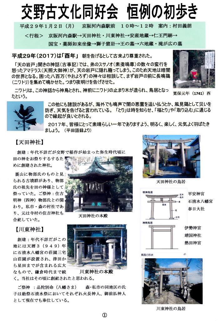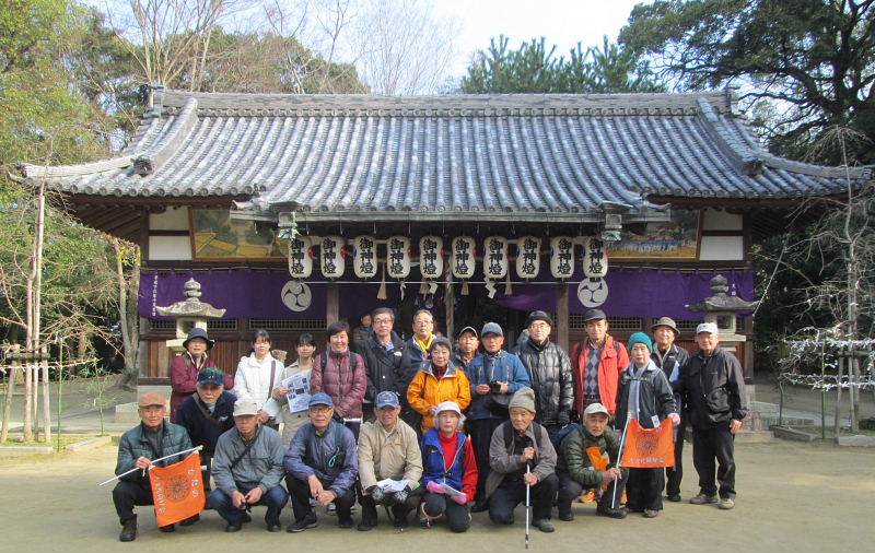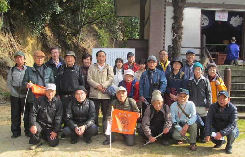 2017年1/2(月)、天候晴れ。参加者23人。年末から穏やかな良い天候が続き、正月三箇日は晴れるでしょうとの予報通り、申し分のない初詣日和となり幸い風もなく暖かく、「明けましておめでとうございます」「どうぞ今年もよろしくお願いします」と、口々に挨拶をしているところへ続々と集合され、総勢23名の元気な皆さんが顔を揃えられた。立花会長の新年の挨拶のあと、天田神社で初詣、全員で記念撮影。当日は2時間30分のウォークとなりました。 (参考資料) 交野市史及び考古編、交野町史、ふるさと交野を歩く(山の編)、その他WEB検索資料 |
