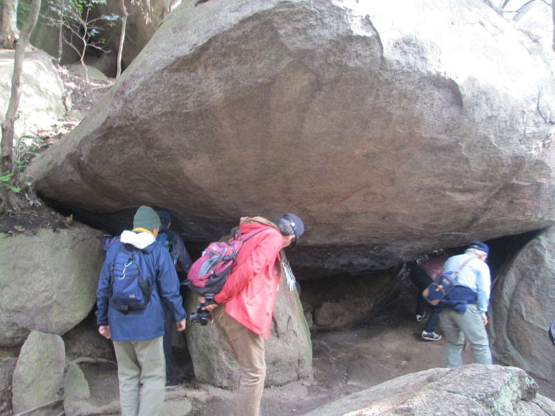 獅子窟寺の本堂の北の石段を上がって、まっすぐ行くと、獅子窟の南側の支え石に突き当たる。 |