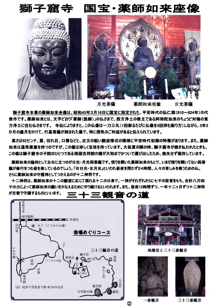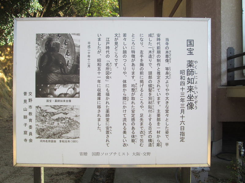 | 大阪府下の4点の国宝仏像は次の通りです。 獅子窟寺 *木造薬師如来坐像(薬師堂安置) 平安時代 道明寺 *(秘仏)木造十一面観音立像(本堂安置) 平安時代 葛井寺 *乾漆千手観音坐像(本堂安置) 天平時代 観心寺 *(秘仏)木造如意輪観音坐像(金堂安置) 平安時代 |