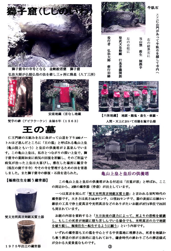 獅子窟寺への山道を登って行くと寺の約150M手前、少し開けた所に仁王門跡の石組みがあり、左へ山道を下り、六体地蔵の前を抜けると、湾曲に突き出した所に、亀山上皇と皇后の供養塔・王の墓が重厚なたたずまいを見せている。 この付近は、見晴らしの良い所から百重が原と呼ばれ、亀山院の分骨陵とか、後亀山天皇陵などと言われていた。辺りには古木が多く、かって王の墓の上のシイの大木の枝を切り落とそうとしたところ、「キイキイ」と泣き、木に触れただけで腹痛を起こしたといういわれがある。 昼なお暗い木立の中にたたずむと、中世の栄華がしのばれる。 |