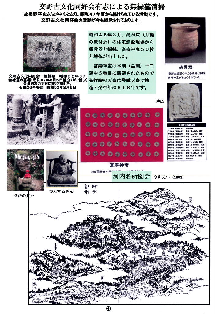 | 交野古文化同好会の無縁墓(昭和52年8月)は、無縁墓の墓標(昭和47年8月6日建立)が新しく会員のお力で石に変わりました。 昭和52年8月6日(石鏃26号参照) 昭和45年3月、滝が広(月輪の滝付近)の住宅建設現場から蔵骨器と銅銭、富寿神宝50枚と塼仏が出土した。富寿神宝は本朝(皇朝)十二銭中5番目に鋳造されたもので発行時の天皇は嵯峨天皇で鋳造・発行年は818年です。 交野古文化同好会有志による無縁墓清掃 故奥野平次さんが中心となり、昭和47年夏から続けられている活動です。 交野古文化同好会の活動が今も継承されております。 |