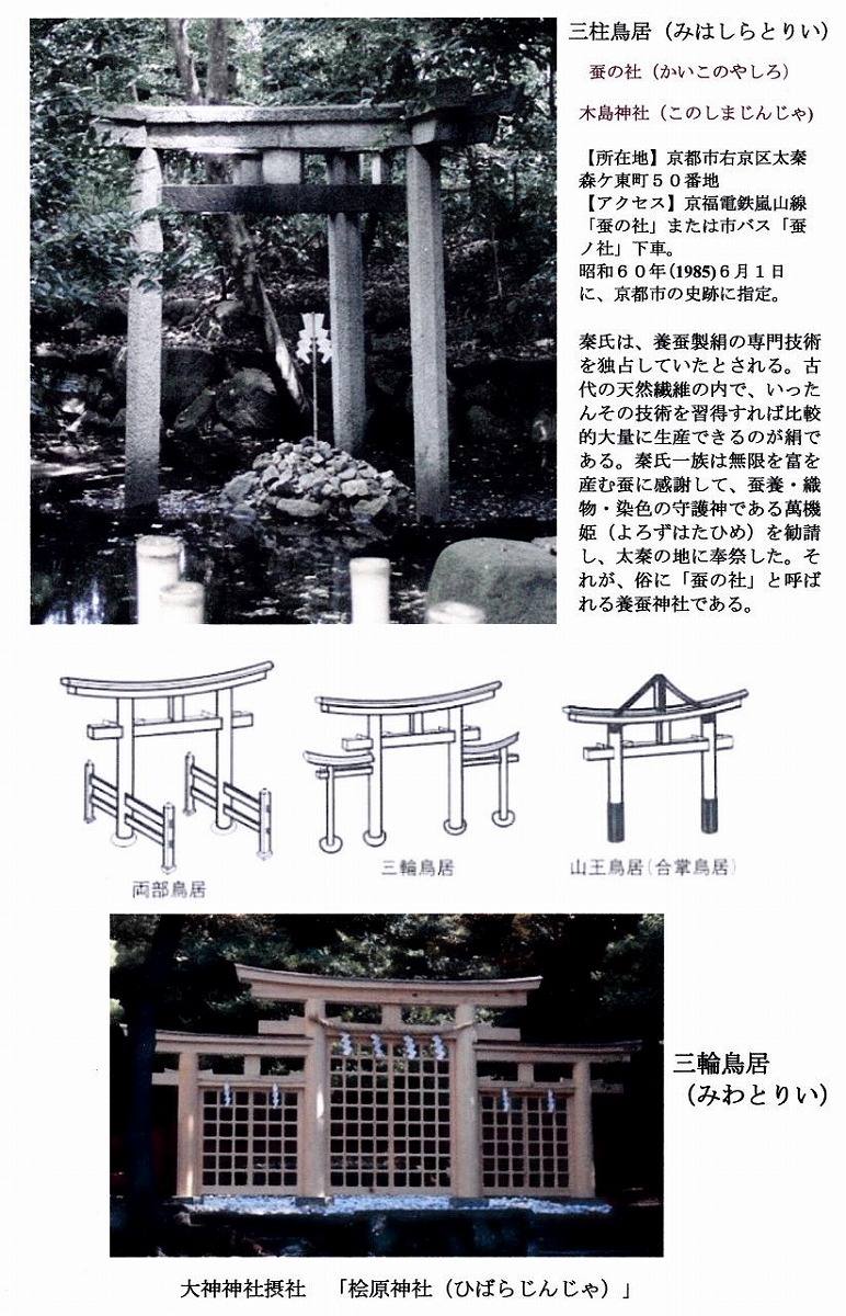 ![]() 鳥居には、次の二つの形が殆どですが、中には、三輪鳥居や三つ鳥居などもあります。 【明神鳥居(みょうじん)】 ・明神系:神明に比べて「明神」系は、仏教建築の影響があり、やや曲線的です。横木は、笠木の下に島木が添えられていて、両端が反っているもの(反増=そりまし)もあります。柱も地面に垂直ではなく、やや斜めに立ち、根元に行くほど太くなっているようになっています(ころび)。安芸の宮島の厳島神社、奈良の春日大社や、京都・平安神宮、石清水八幡宮が「明神」系になります。 明神鳥居(みょうじんとりい)は上の横棒が上にそっていて、下の棒が柱の外に出ています。縦柱は斜めです。OO明神というような神社などでよくみられます。漆をぬることが多くみられます。 【神明鳥居(しんめいとりい)】 ・神明系:「神明」系は、シンプルな形で横木には島木がなく、笠木と貫の二本で、縦柱もまっすぐ垂直に立っています。伊勢神宮や靖国神社、熱田神宮、鹿島神宮などが、この「神明」系の鳥居です。 |