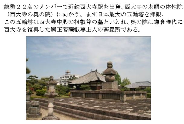 | 行程; JR河内磐船駅→京田辺駅→西大寺駅→西大寺奥の院・体性院→ 西大寺→平城宮跡会場→東院庭園→西大寺駅(解散) 徒歩約10km |