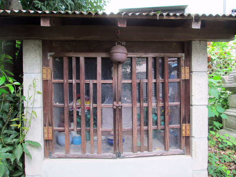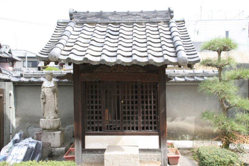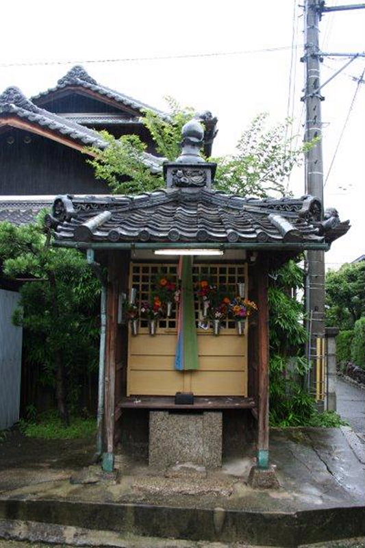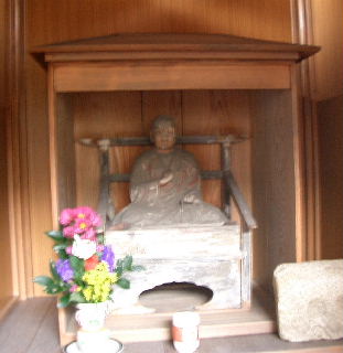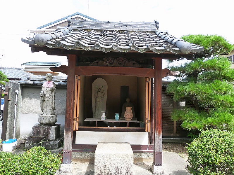 | 先ず、最初に案内されたのは、半尺口のお大師さん。一里塚にあった時、寝屋の人が盲目となり、夜静かになって夜参りに杖を頼りに3年間祈願し続けたご利益があり、ある夜お大師さんの「私の片目をお前にあげる」とのお告げがあって、その日から片目が見え出し、代わりにお大師さんの右の片目に傷が出来て、その傷は今ものこっているのだそうだ。 それ以後信仰者が多くなり、4月21日には三角のおむすびに黄粉をつけて参拝者に供養されるが、昭和12年ごろまでは星田だけでなく、堀溝・高宮・小路(寝屋川市)、砂・中野村(四條畷市)の人々も沢山お参りし、また、「どんかい踊り」が催され、大変な賑わいだったそうである。 山本さんの先導で遠見遮断の道路をあっちへ行きこっちへ曲がりと、次から次へとお大師さんめぐりを楽しませて頂いた。合わせて13ヶ所のお大師さんにお参りしました。お大師さんは星田1丁目から3丁目の間の狭い範囲内に安置されており、その多さにビックリです。また、地元の方によっていつも綺麗なお花が飾られて今も大事に守られていることを知った。 |