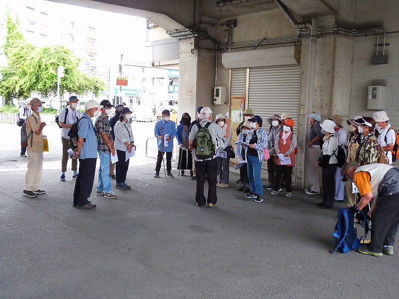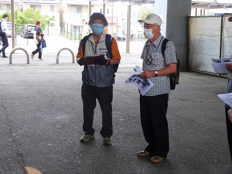 ![]() 星田駅の高架下で開会の挨拶 案内役は山本秀雄氏(左)と村田会長 |