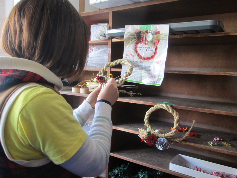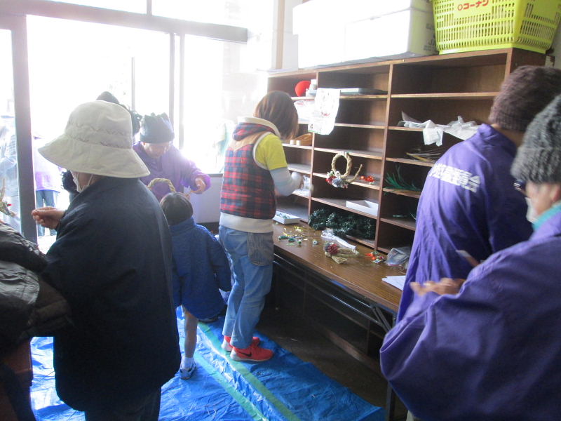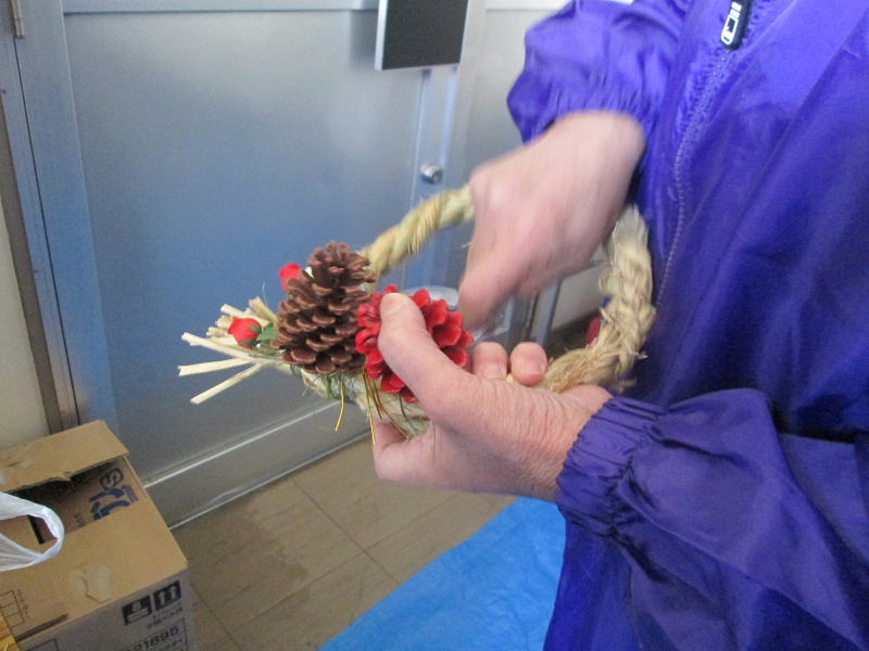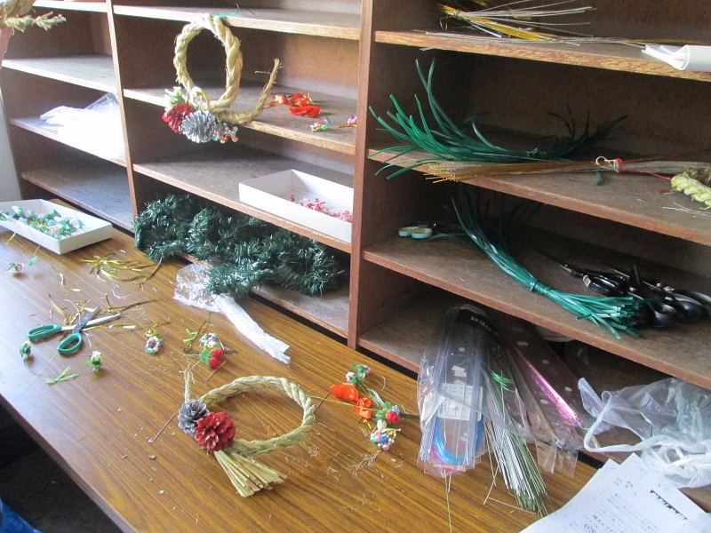 | 会館玄関口では飾り物の作業中 | |||||||